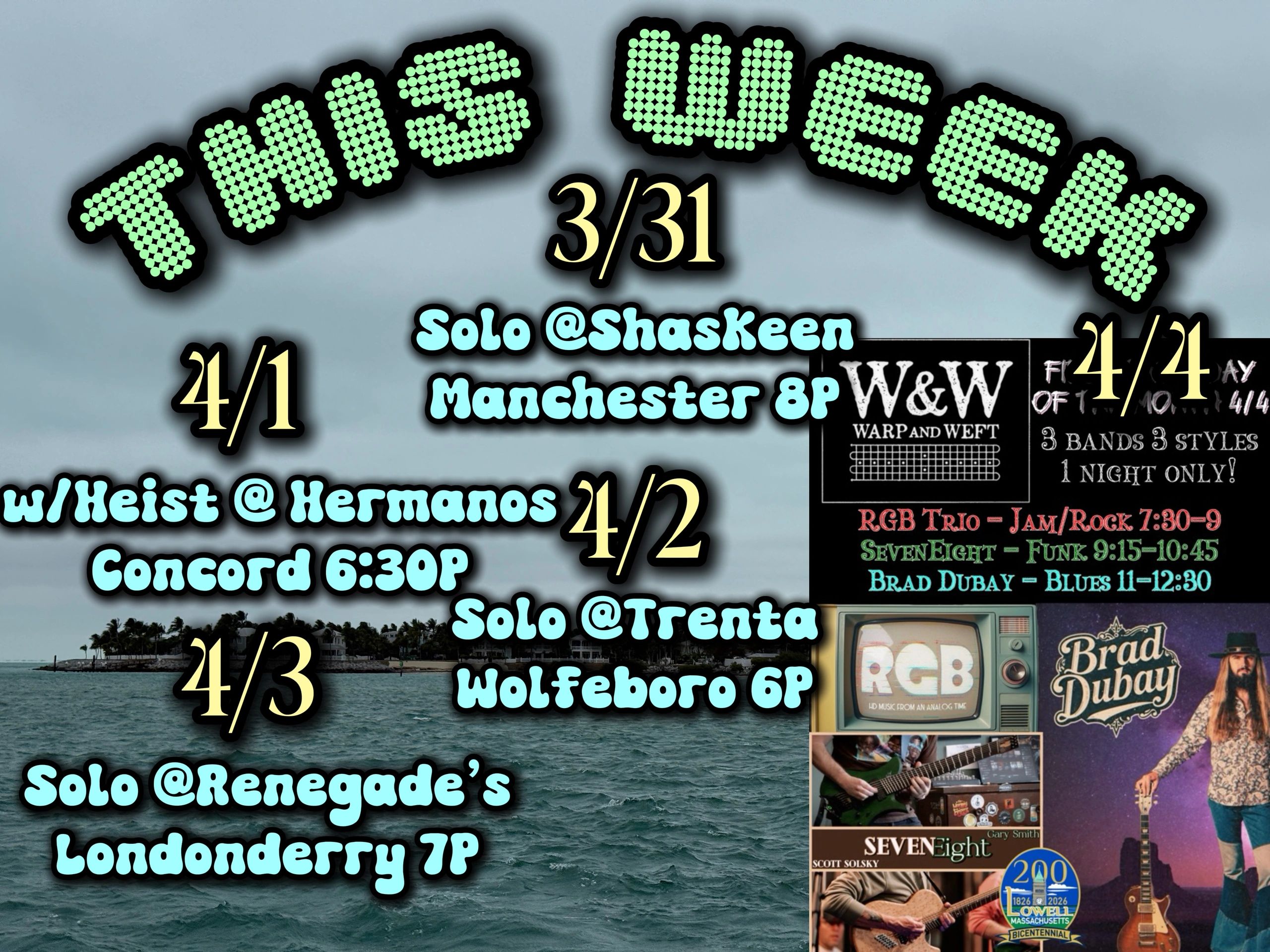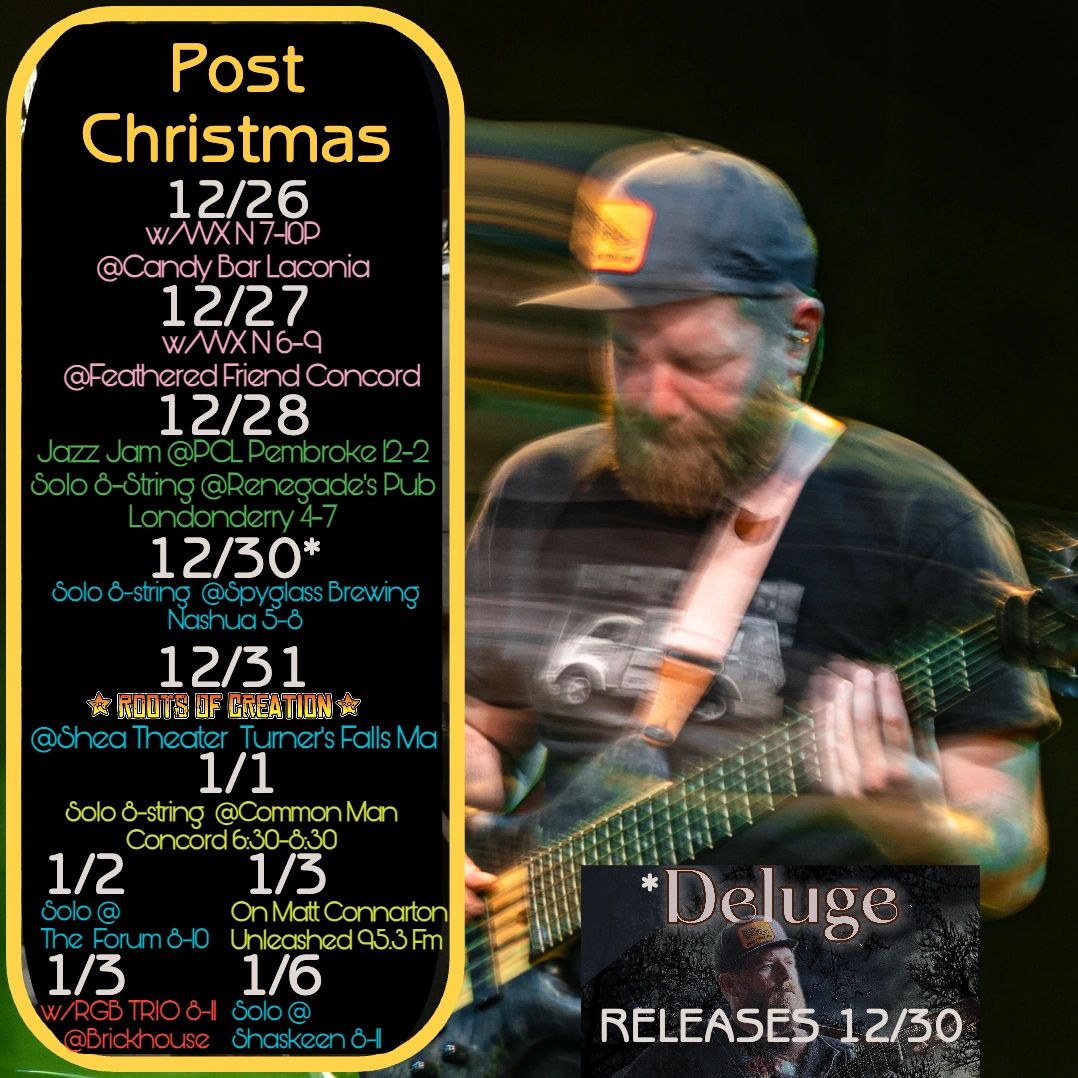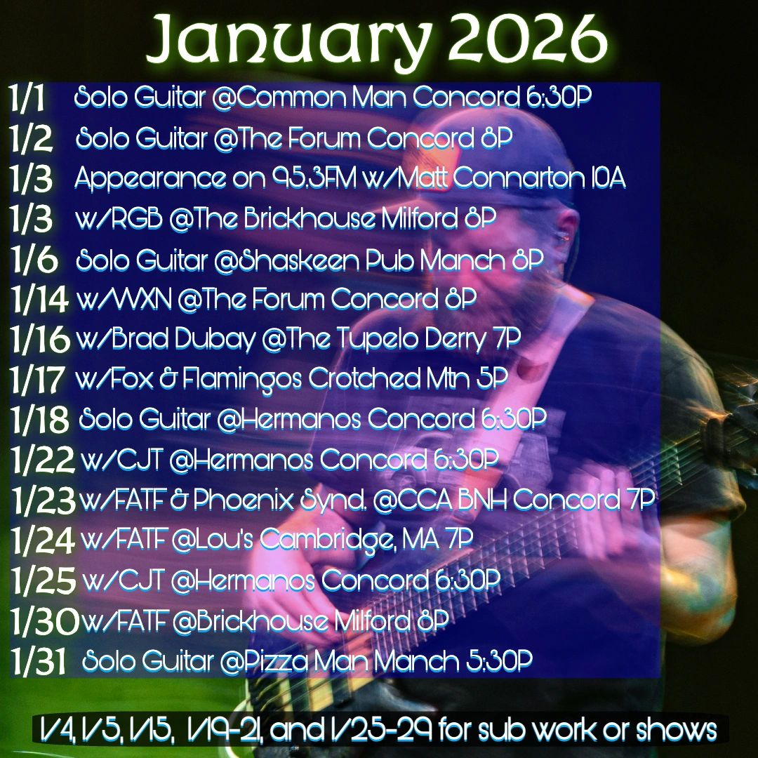 You'll find me out doing this most often at spots across New Hampshire. A combination of solo jazz guitar and some fun looped stuff combined with my 8 string guitar. The most eclectic set you've ever heard, currently covering the classics from Gershwin to Stevie to Coltrane, and more modern tunes from the 90s on!